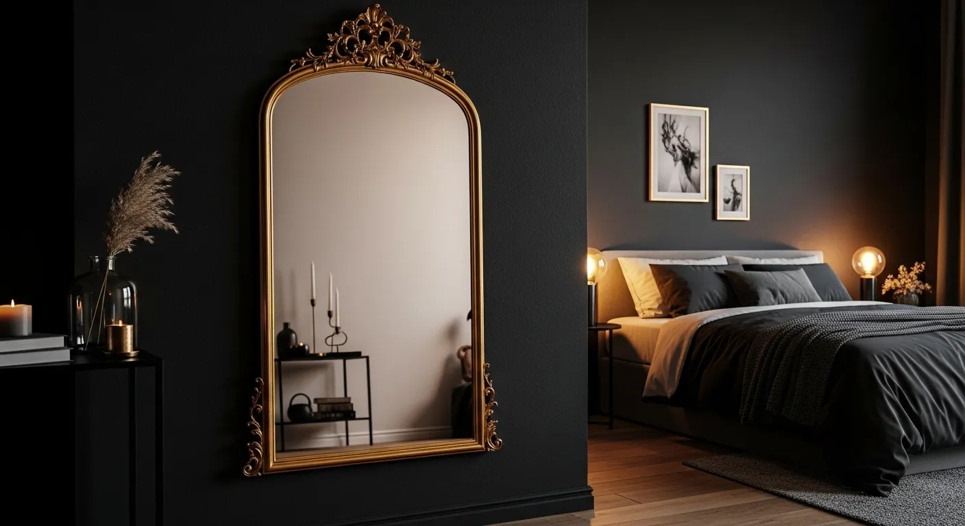 A vintage gold mirror can instantly elevate the look of your bedroom while making the space feel brighter and more open. The reflective surface helps bounce light around the room, which is especially useful in darker color schemes. I’ve seen this work beautifully in spaces that feel a bit too enclosed, as the mirror adds depth without changing the layout. It’s a simple addition, but it brings both function and style together effortlessly.