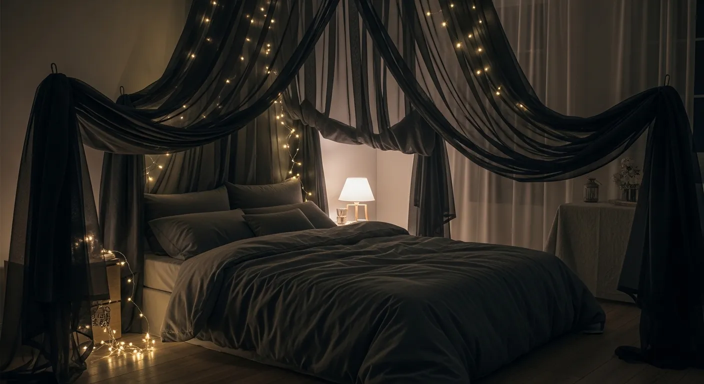 A canopy setup instantly changes how your bedroom feels the moment you walk in. The flowing fabric creates a sense of privacy and softness that makes the bed feel like a personal retreat. I’ve seen this work especially well with darker sheer fabrics because they filter light gently instead of blocking it completely. This helps maintain a soft glow while still keeping the room cozy and intimate, which is exactly what you want for a relaxing nighttime environment.