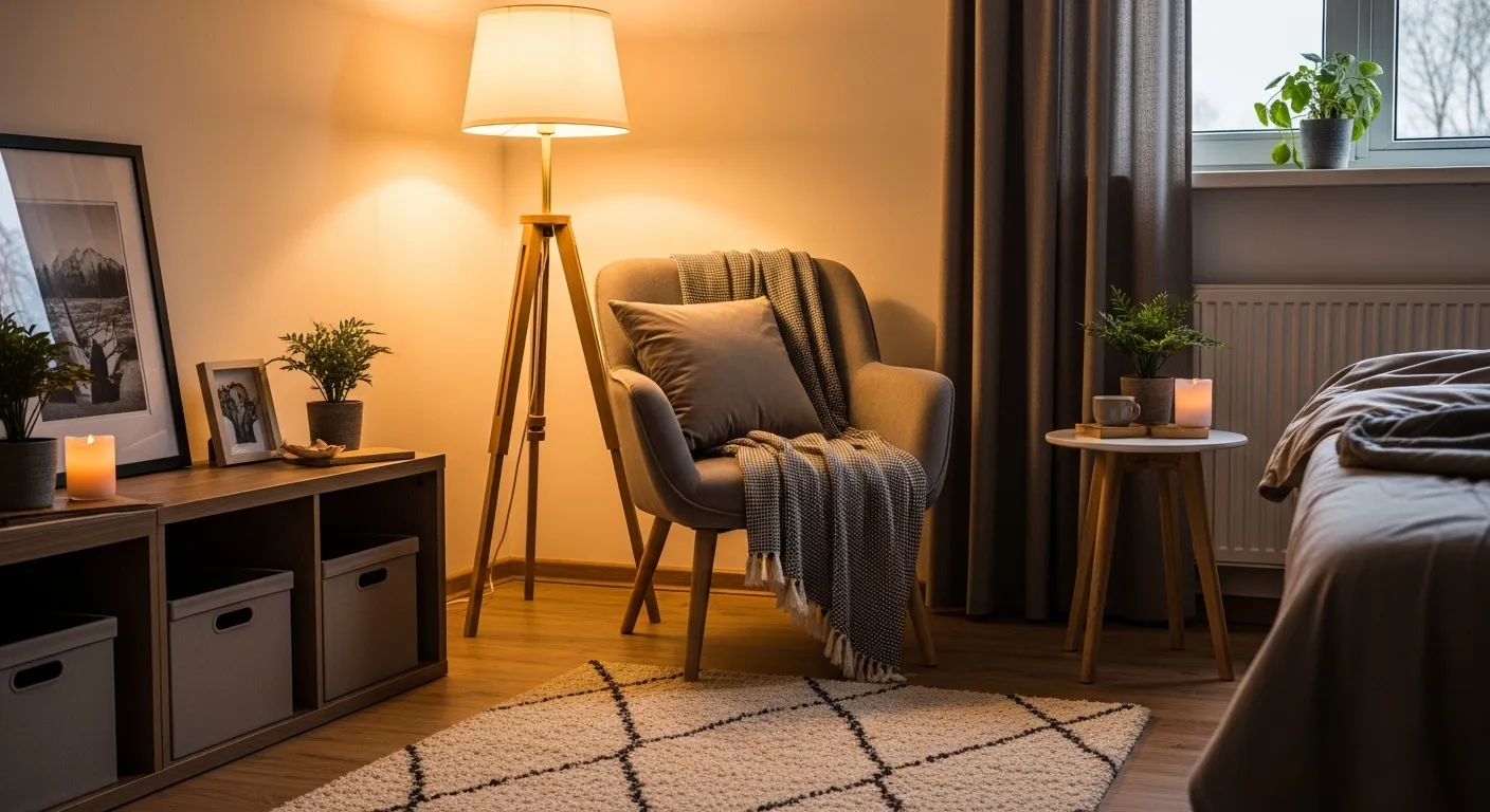 Soft, warm lighting is key. Use a mix of table lamps, floor lamps, fairy lights, or candles to create layers. Avoid bright white lights. In my experience, lighting placed at different heights makes the room feel more relaxed and visually balanced.