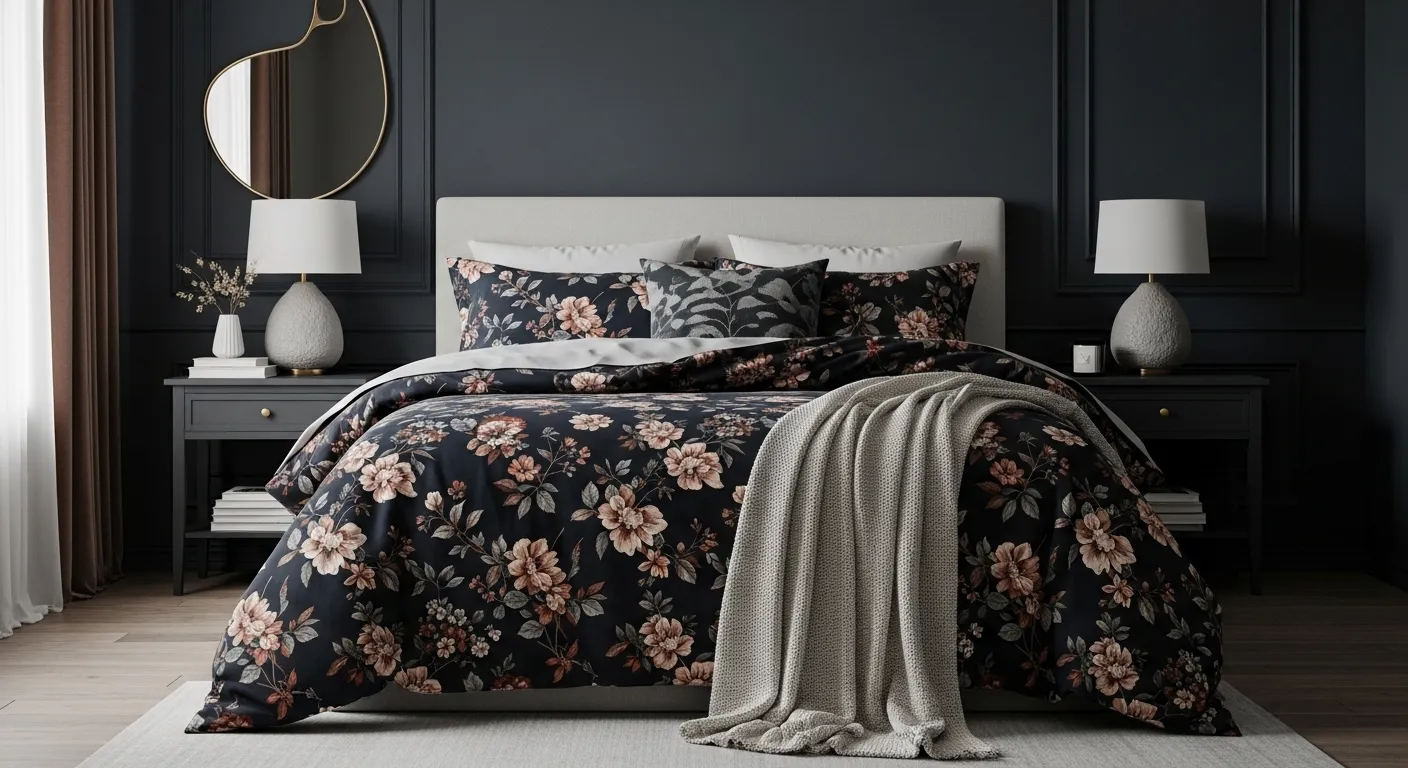 What I love most about this idea is how effortlessly it balances boldness and softness. The darker background keeps the look mature and calming, while the floral patterns add just enough detail to keep things interesting. In my experience, pairing this bedding with neutral or textured throws enhances the layered effect even more. This combination helps create a space that feels both styled and comfortable, which is exactly what most people want from their bedroom.