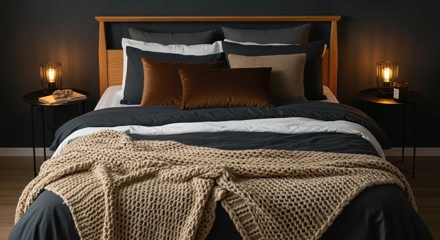 Layered bedding is one of the simplest ways to make your bedroom feel instantly warmer and more inviting. By combining different textures like cotton, velvet, and knit, the bed becomes the focal point of the room. I’ve noticed that this approach works especially well in darker spaces because it prevents the room from feeling too flat or one-dimensional. The layers add softness visually, which helps balance out deeper color tones and creates a more comfortable atmosphere.