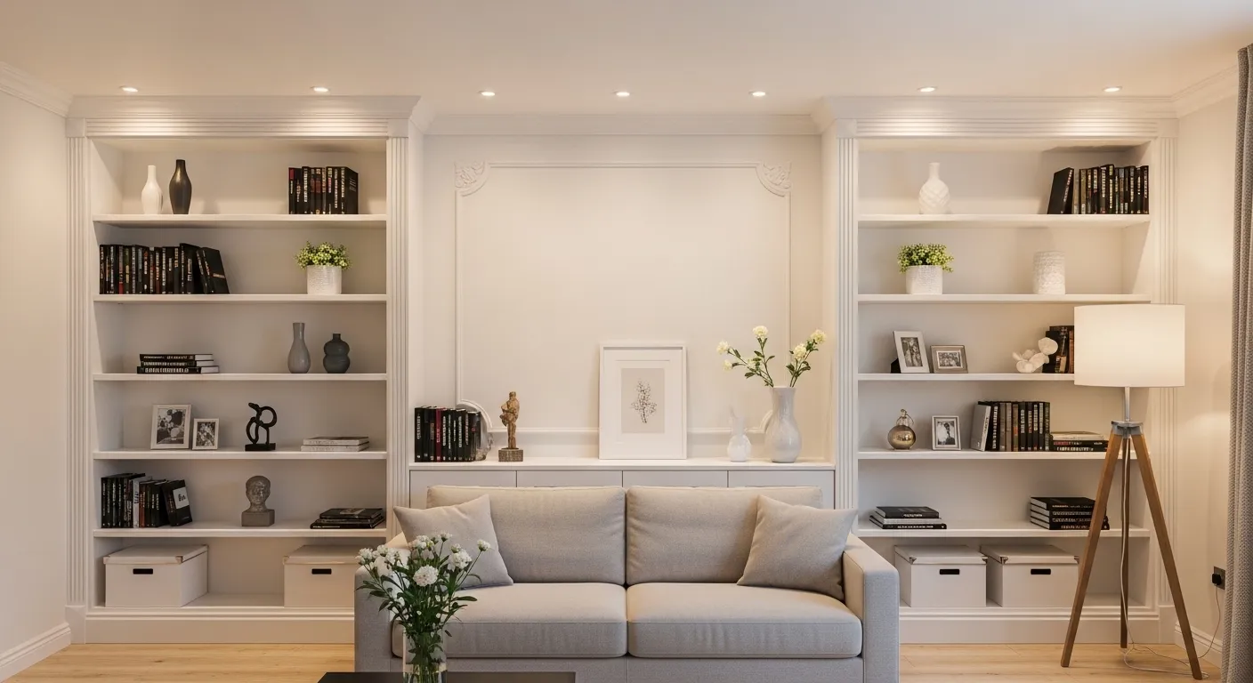 Built-in shelving is one of those features that instantly makes a space feel more complete and thoughtfully designed. It provides storage while also acting as a decorative element that adds depth to the room. In my experience, well-styled shelves can become a focal point without overpowering the rest of the space. They help organize everyday items while still keeping the room visually clean and balanced.