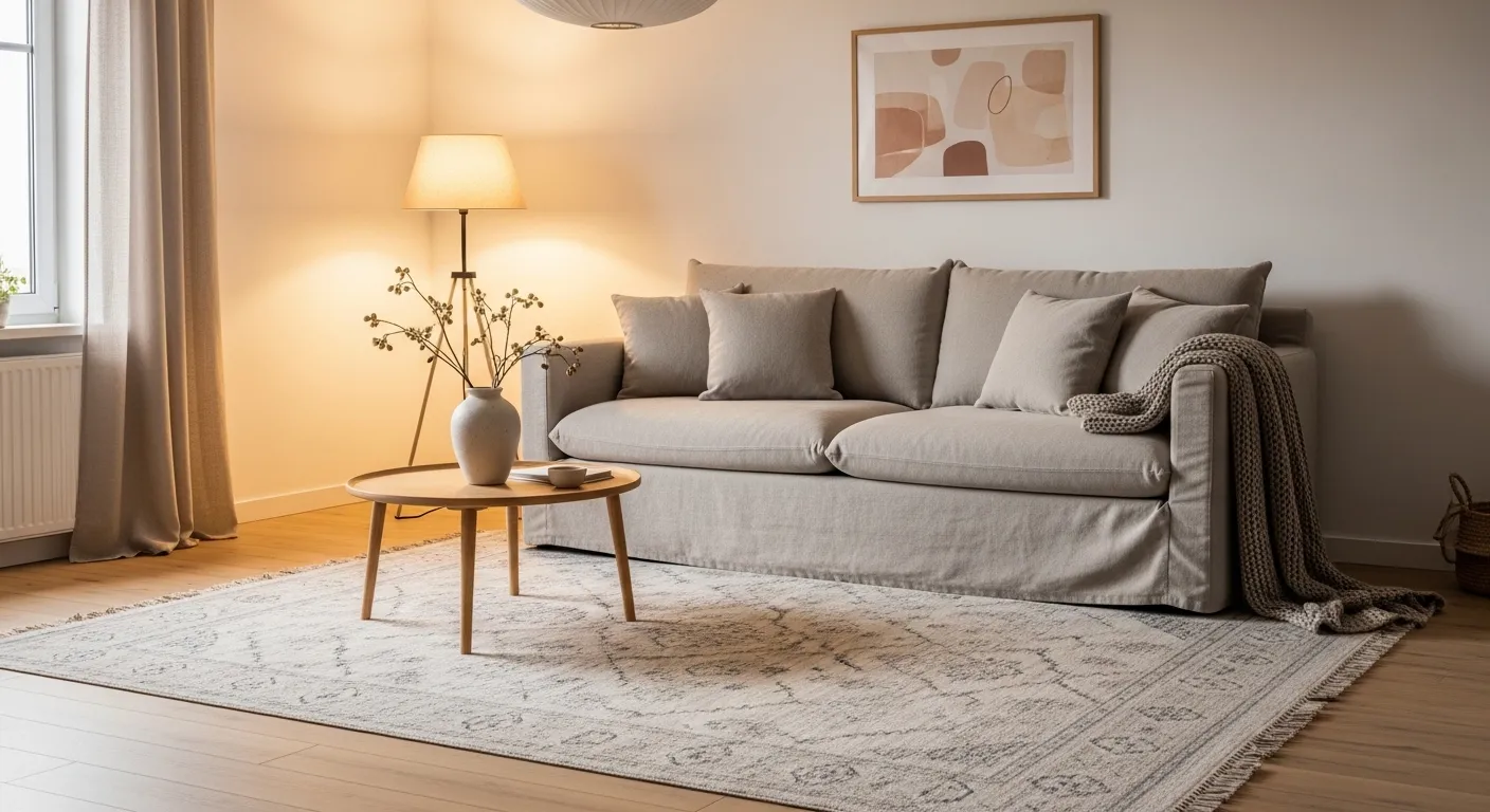 A neutral patterned rug is one of the easiest ways to add depth without disrupting the calm feel of the space. Instead of bold colors, soft patterns create gentle movement that keeps the room visually interesting. In my experience, rugs like this help anchor the furniture and make the layout feel more intentional. They quietly connect different elements, making everything look more cohesive without drawing too much attention.