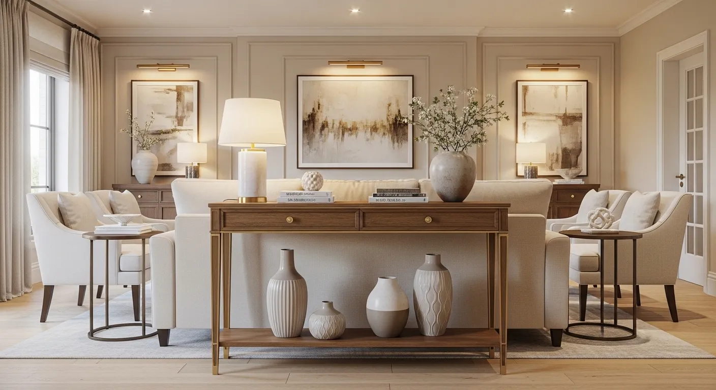 What makes this idea so useful is how versatile it is in different room sizes and layouts. You can style it simply or add layers depending on your preference. I’ve seen this work especially well in open spaces where defining zones can be challenging. It enhances a modern classic living room by adding both function and elegance, helping the space feel more thoughtfully designed.