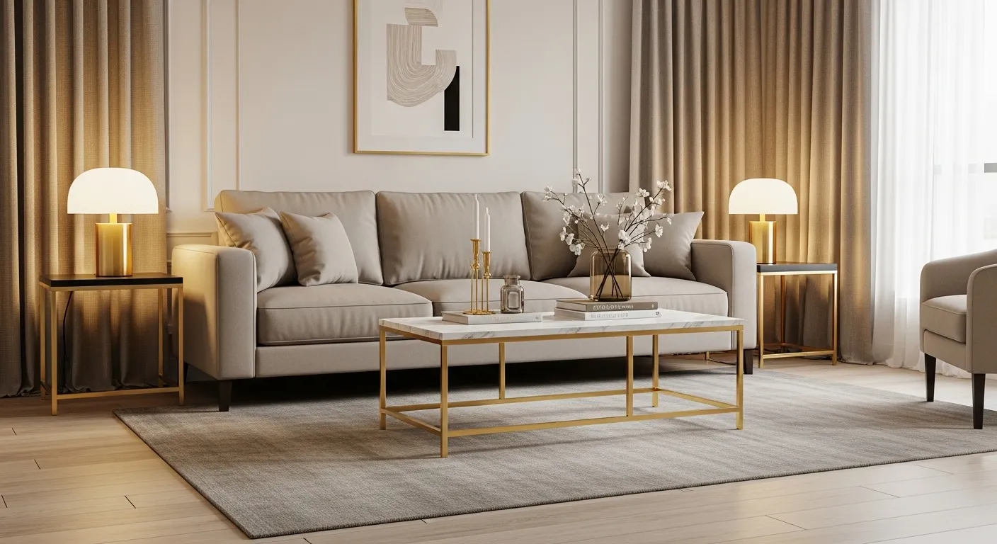 The key is to keep it balanced and not overuse the material. A few well-placed accents go much further than filling the space with shine. That’s why many designers recommend mixing gold with soft textures and neutral tones for a more refined look. It fits perfectly into a modern classic living room by adding just enough contrast and elegance while keeping the overall atmosphere calm and cohesive.