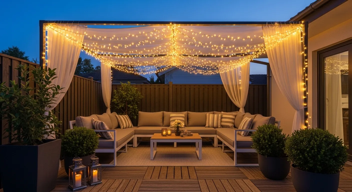 This idea works beautifully because it defines the space without needing walls or heavy structures. The gentle draping effect adds movement and softness, which balances hard outdoor materials like wood or stone. In my experience, even a small backyard feels bigger and more styled with overhead lighting like this. It also photographs incredibly well, making it perfect for Pinterest-worthy setups. Once installed, it becomes both a functional lighting source and a decorative feature that instantly elevates the entire outdoor atmosphere.