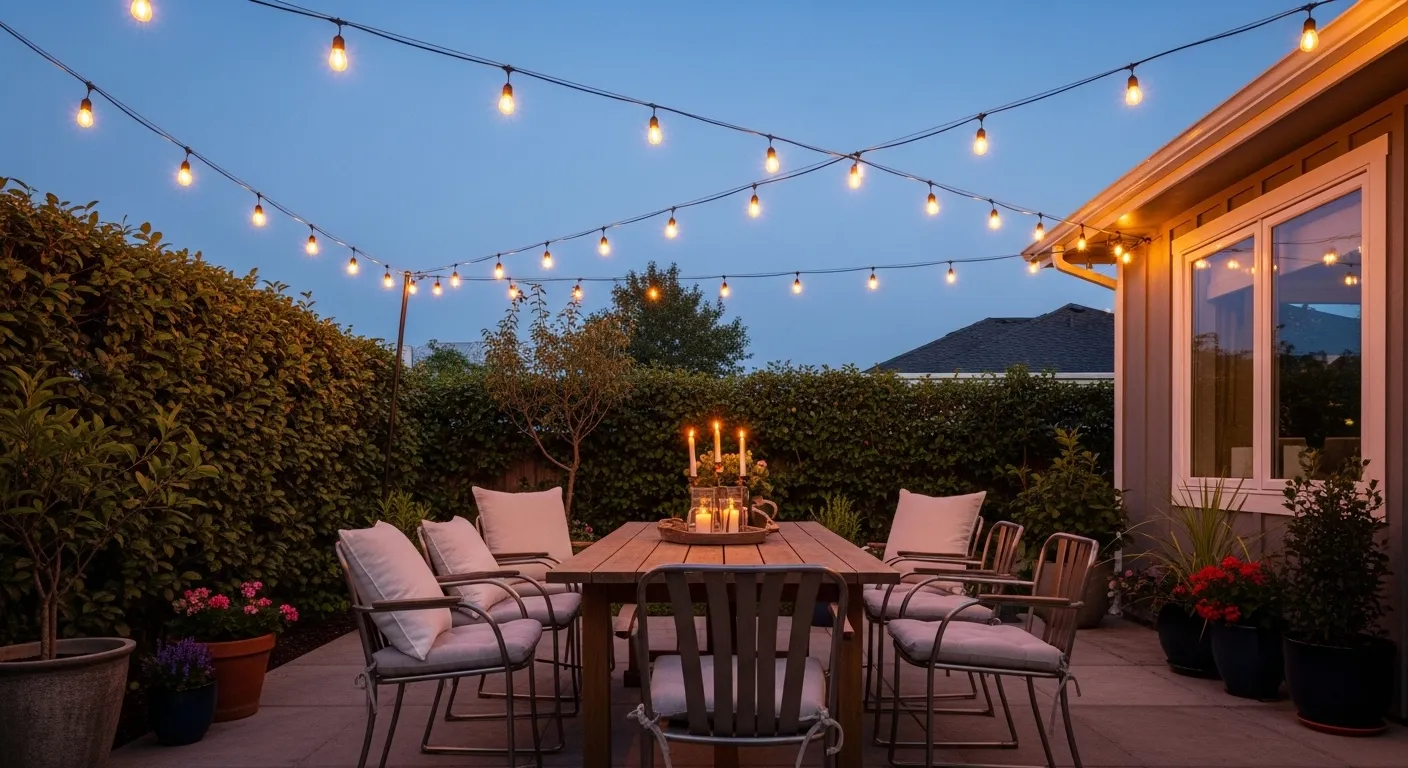 A backyard can instantly feel like a cozy café with the right lighting overhead. Bistro light strings are a simple way to spread warm, even light across a larger area without making it feel too bright. I’ve noticed this setup works especially well for patios where people gather to eat, talk, and unwind. The soft glow creates a welcoming environment that feels both casual and thoughtfully styled, making everyday moments outdoors feel more special and enjoyable.
